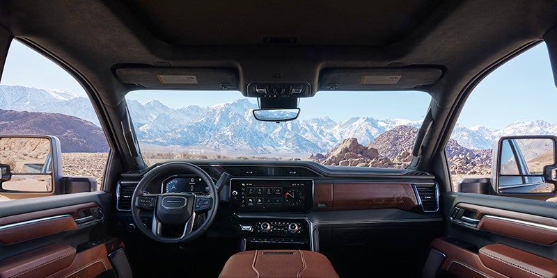Sierra HD Denali Ultimate’s Alpine Umber interior features full-grain leather seating, plaited contrast stitching, and embossed and laser-etched topographical map patterns of Mt. Denali’s summit.